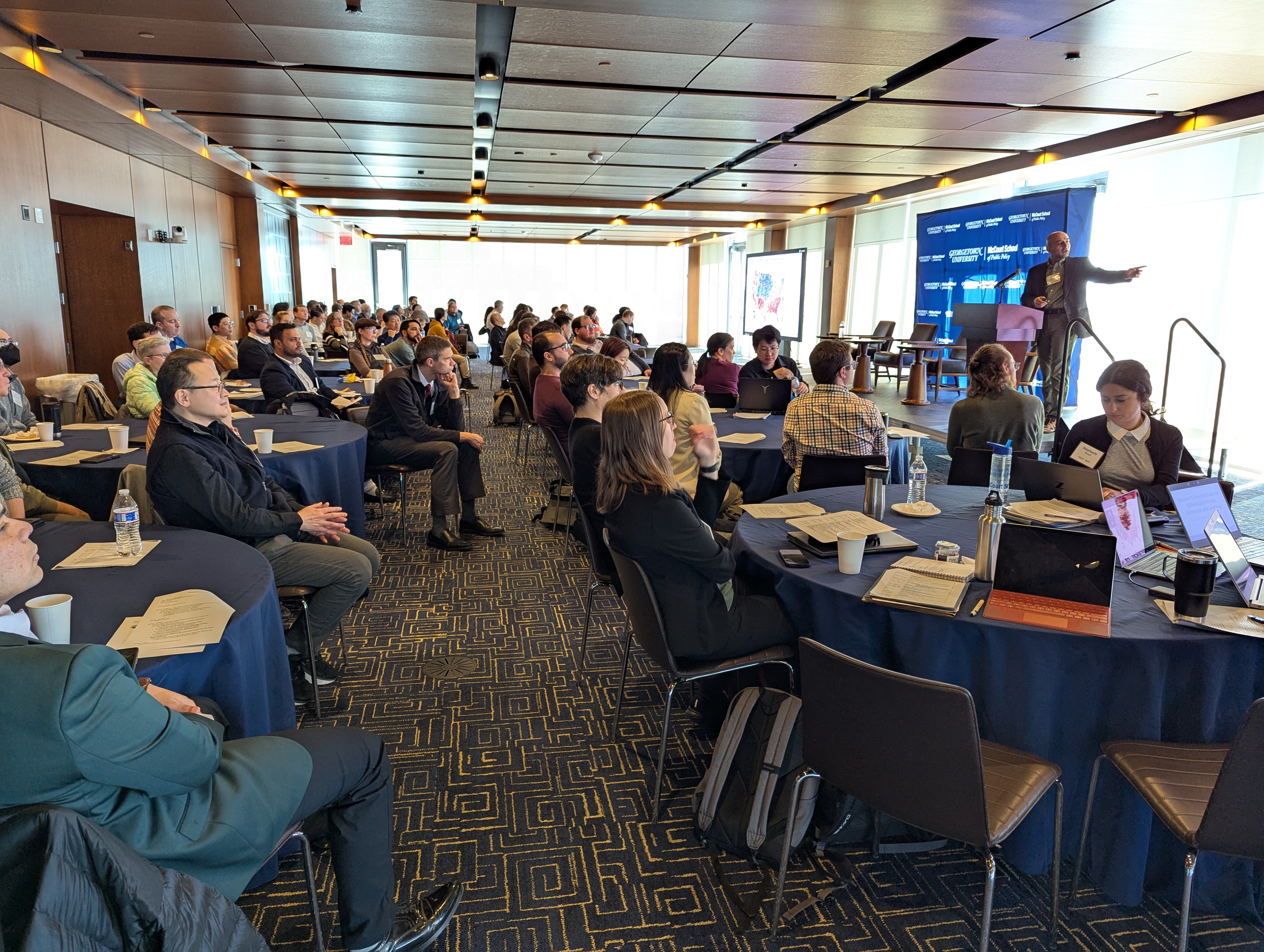 The conference committee put together a two-day conference with a single-track format. The event started with an invited panel of speakers who discussed the current state of data privacy, where we’re headed, and what hurdles need to be tackled. The rest of day one was filled with presentations from privacy and public policy experts about novel methods in differential privacy and new concepts in the data privacy space. The afternoon and evening featured lightning talks and a poster session involving numerous projects with topics ranging from privacy methods, to legal considerations, to data governance, and even new modes of data access.
